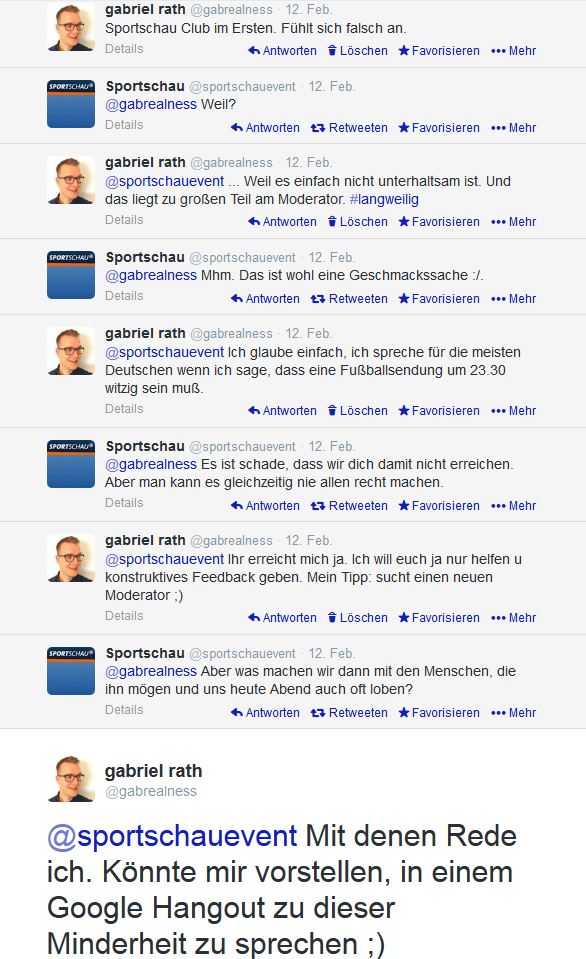 Ich kenne ja die andere Position nur zu gut, habe schon für verschiedenste Marken gefacebookt und getwittert (darunter der Mobilfunkanbieter Fonic, der kanadische Tourismusverband CTC, zwei Agenturen, ein Startup, eine Personalvermittlung, ein Feinkosthandel, etc) Jedenfalls fragte die Sportschau ganz interessiert nach dem Grund meiner Unzufriedenheit.