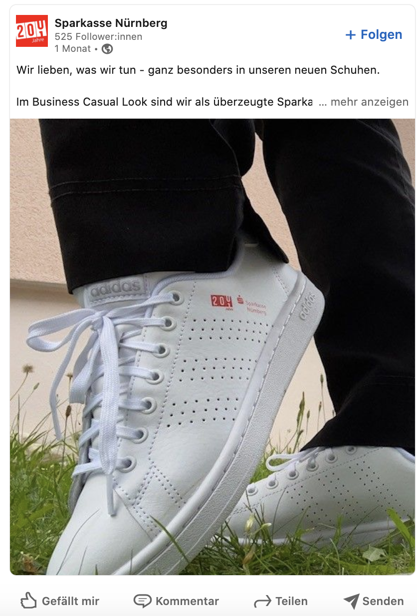 Ich habe meinen Workshop mit einem LinkedIn Post der Sparkasse Nürnberg eröffnet, die kürzlich stolz ihre neuen Sneakers präsentierten.