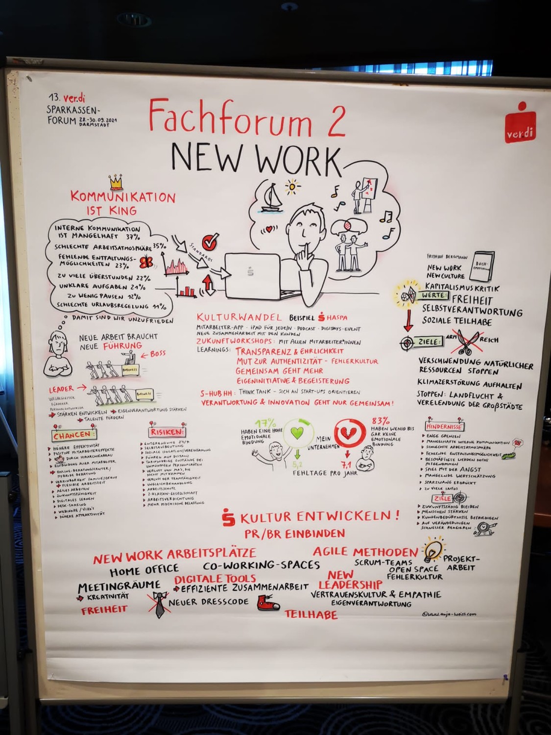 In meinem Fachforum „New Work in der Sparkasse“ diskutierte ich am Dienstag und Mittwoch mit je 30 Personalräten aus allen Teilen des Landes die Chancen und Risiken von New Work für den roten Riesen. Dabei besprachen wir die wichtigsten Hürden, die neue Arbeitsweisen bremsen.