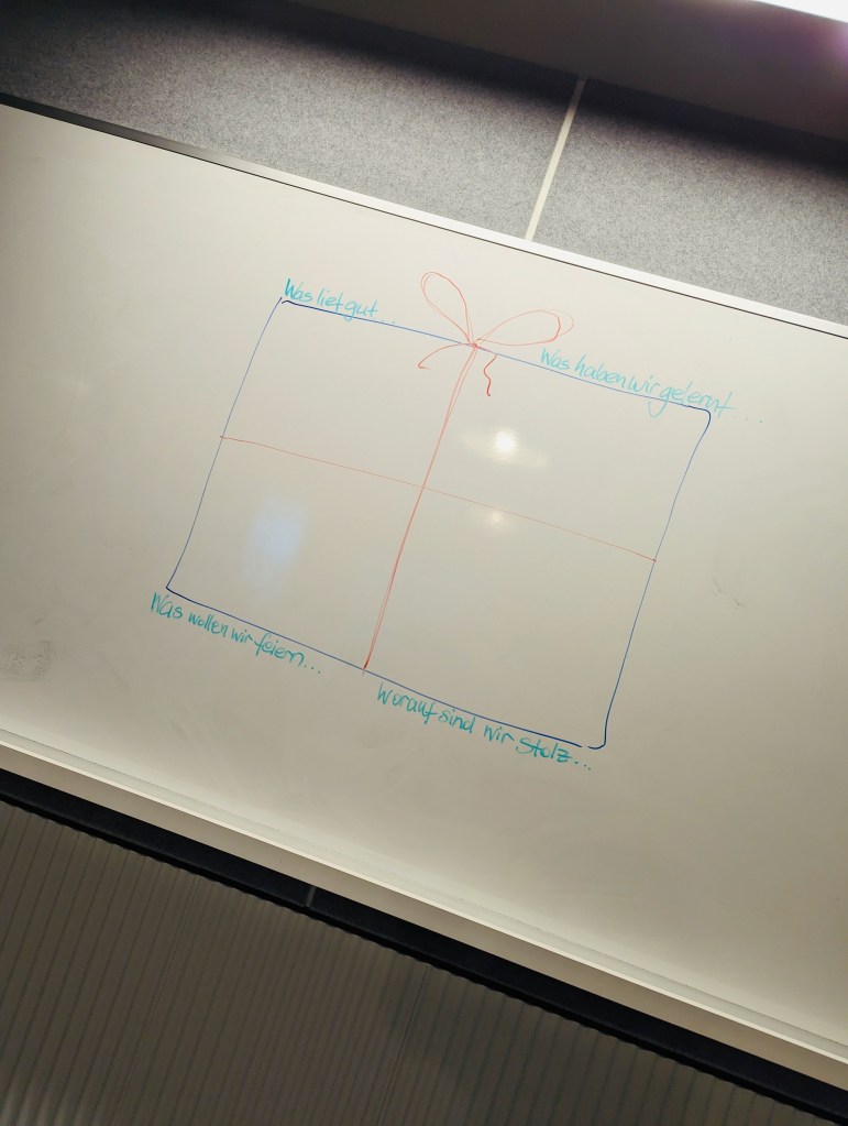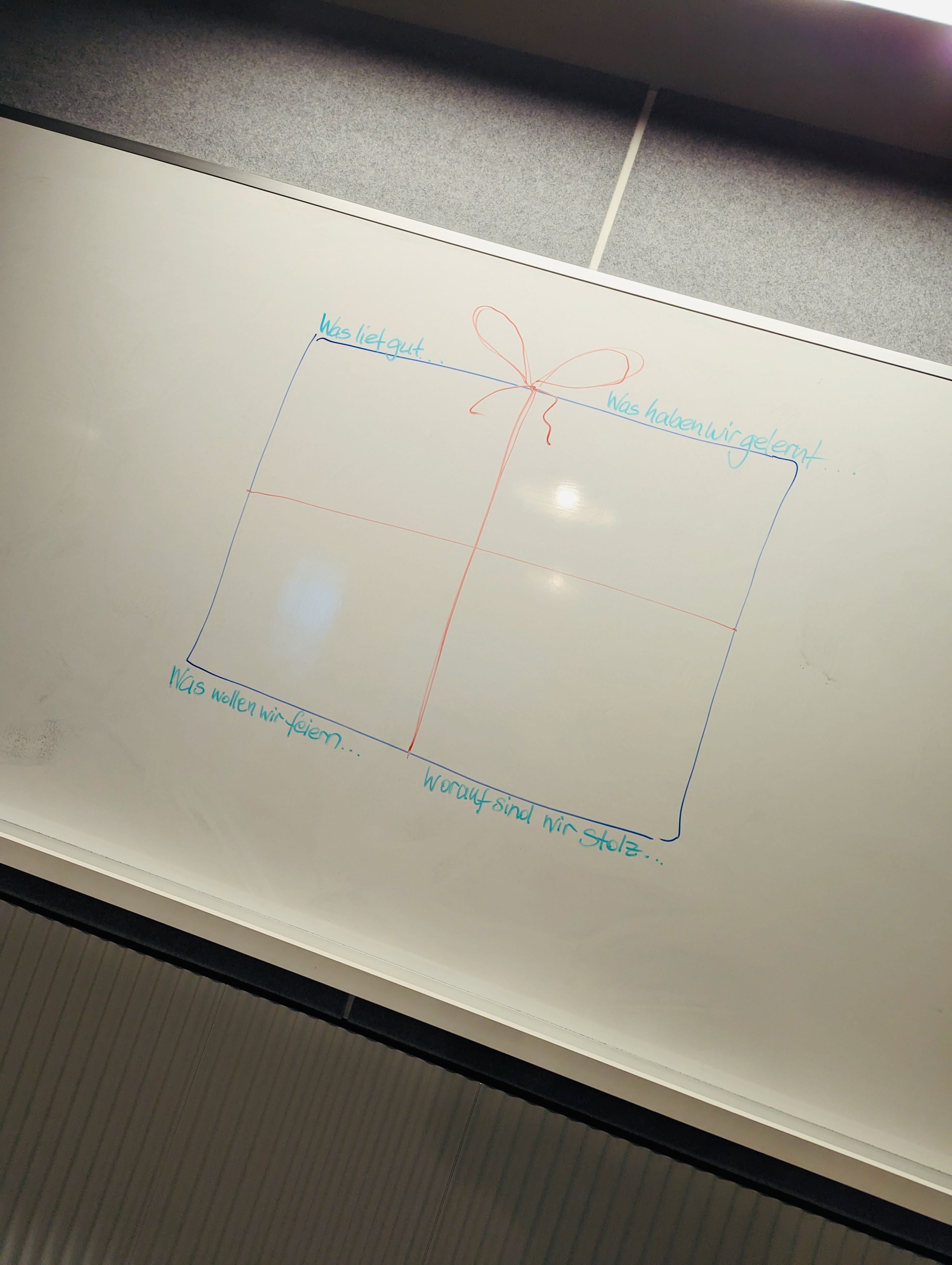 Anschließend fuhren ins WeWork am Potsdamer Platz und machten als Team eine Jahresretro. Dabei griffen die 4 Fragen auf, die Domenika Rinke gestern früh hier auf LinkedIn teilte. Vielen Dank dafür. 🙂