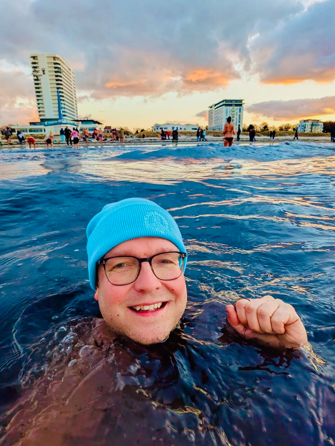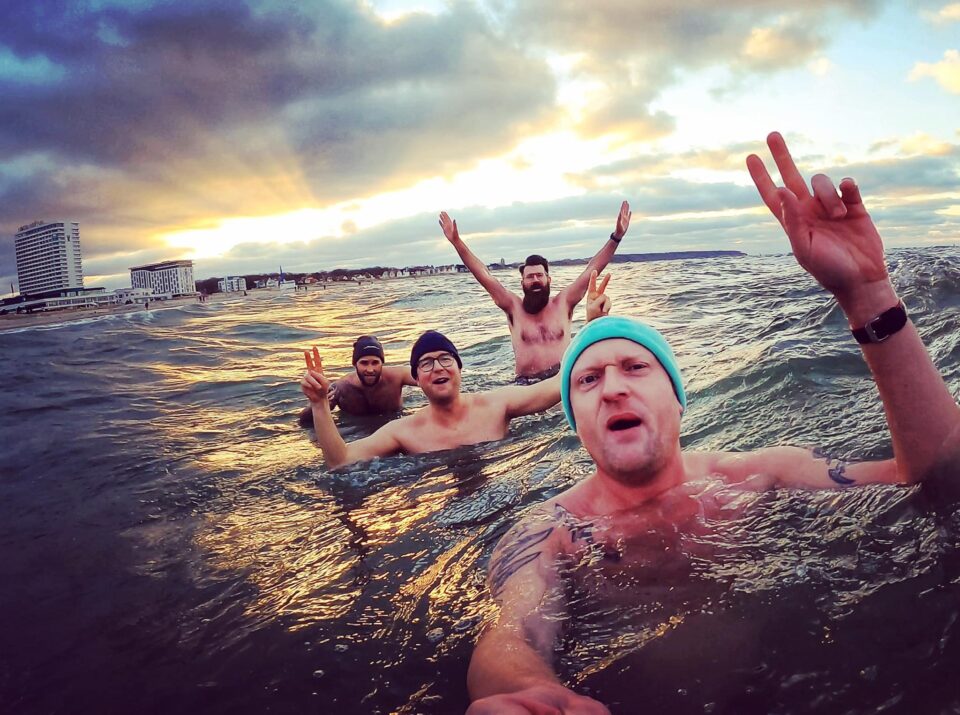 🧊 Seit 2020 machen wir das jetzt jeden Winter. Und am 1. Januar geht es dann wieder los mit dem Neujahrsanbaden in Warnemünde. Da sind dann schon mal 250-300 Leute im Wasser. Gut, dass wir schon einen Sponsor an Land gezogen haben, der 30 € pro Kopf gibt, der sich mit uns ins kalte Wasser traut.